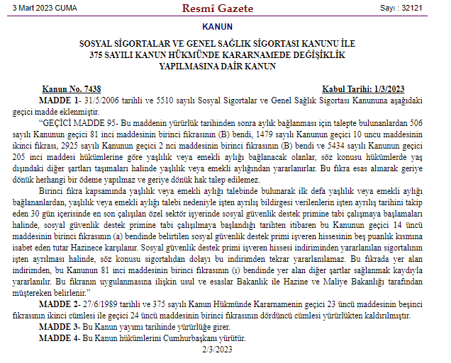 Resmi gazetede EYT ile ilgili “Kanun No. 7438 – Kabul Tarihi: 1/3/2023 – Sayı: 32121” olarak yayınlanmıştır.